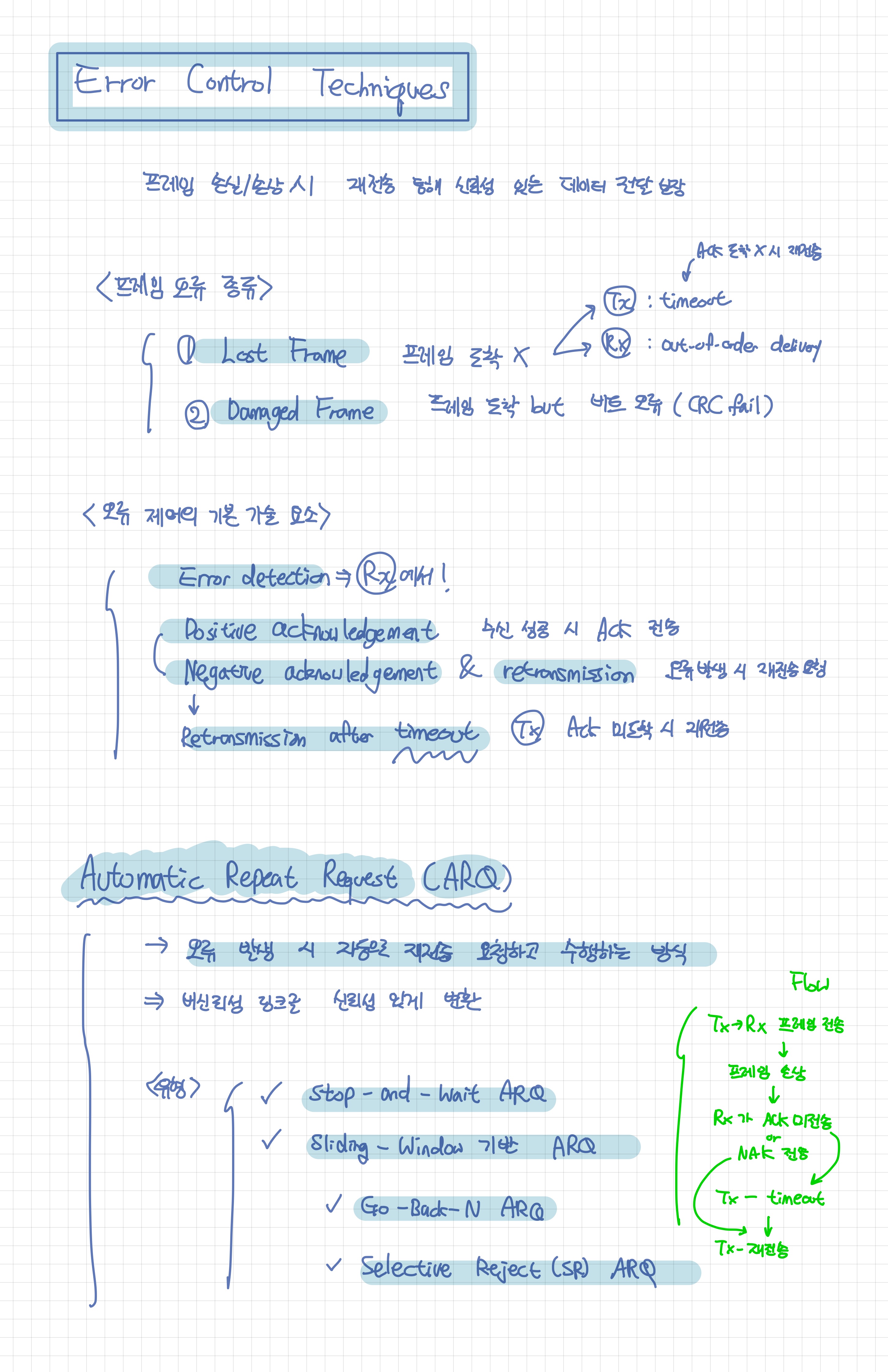 | ARQ의 목적 | 오류가 있는 프레임을 송신 측에서 재전송하여 신뢰성 확보 |