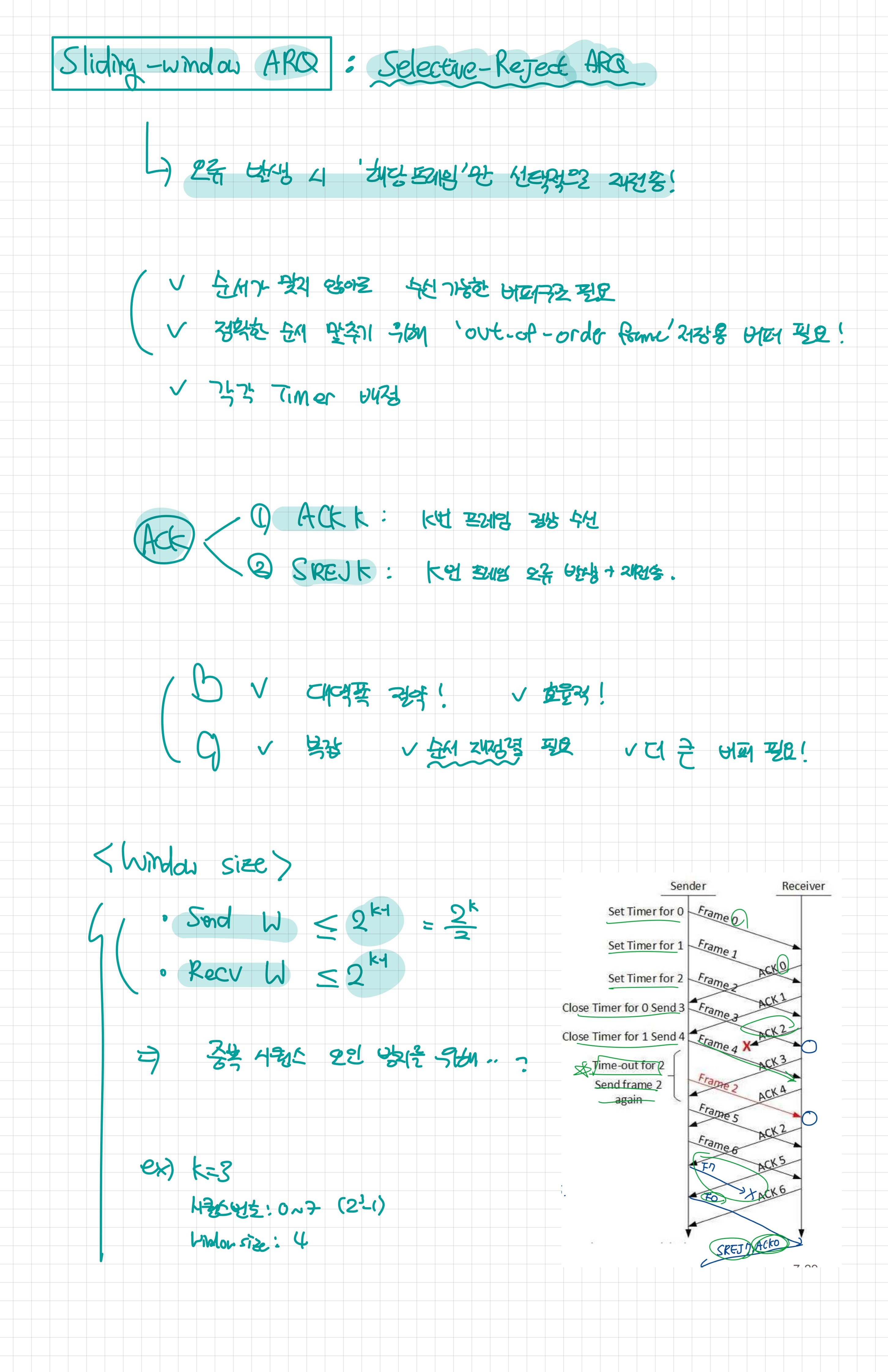 | ACK 종류 | ACK0, ACK1 (Positive only) | RR (Receive Ready), REJ (Reject) | RR, SREJ (Selective Reject) |
