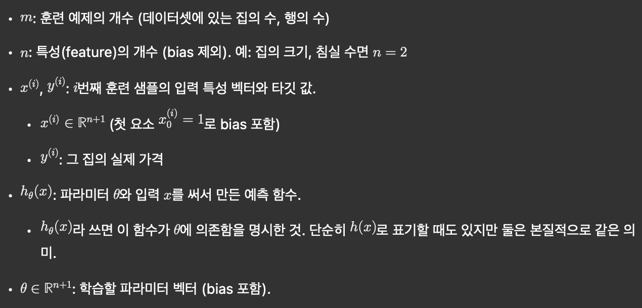 - 다중 특성 확장:h_\theta(x) = \theta_0 + \theta_1 x_1 + \theta_2 x_2h_\theta(x) = \sum_{j=0}^n \theta_j x_j = \theta^T x