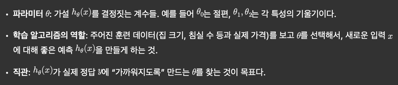 - 가설 h: 새로운 집의 크기 등을 입력받아 가격을 예측하는 함수.