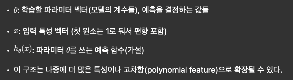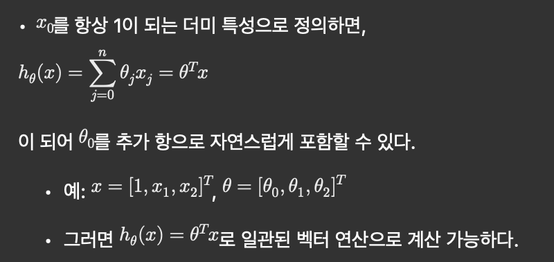 - 특성이 n개면, 편향을 포함시켜 입력 벡터 x와 파라미터 \theta는 각각 n+1 차원.x = \begin{bmatrix} 1 \\ x_1 \\ x_2 \end{bmatrix},\quad \theta = \begin{bmatrix} \theta_0 \\ \theta_1 \\ \theta_2 \end{bmatrix}, \quad h_\theta(x) = \theta^T x