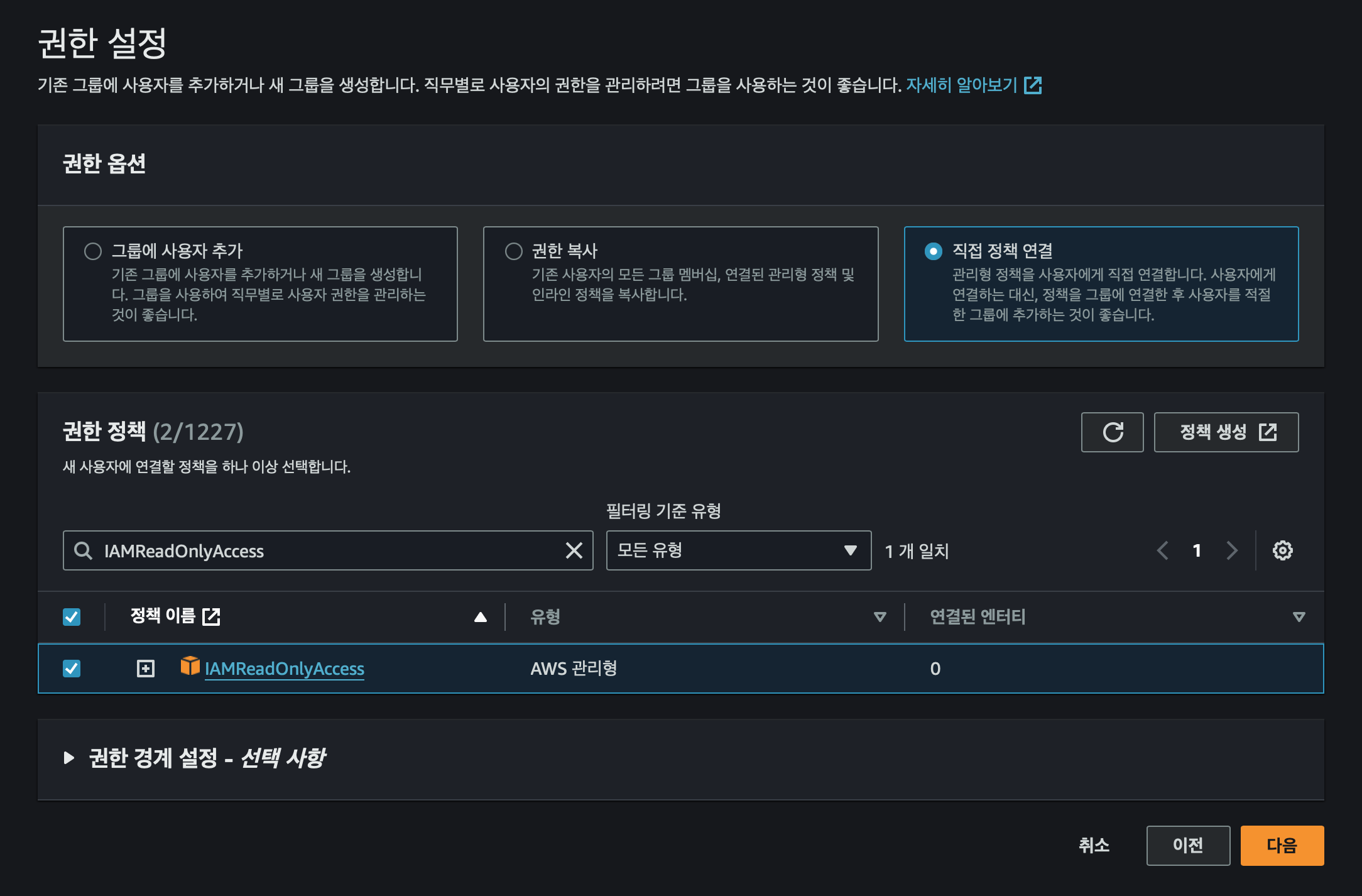 - IAMReadOnlyAccess: 사용자가 필요로 하는 IAM 리소스의 구성을 조회할 수 있지만 변경은 할 수 없습니다. 이는 보안을 강화하는 데 도움
