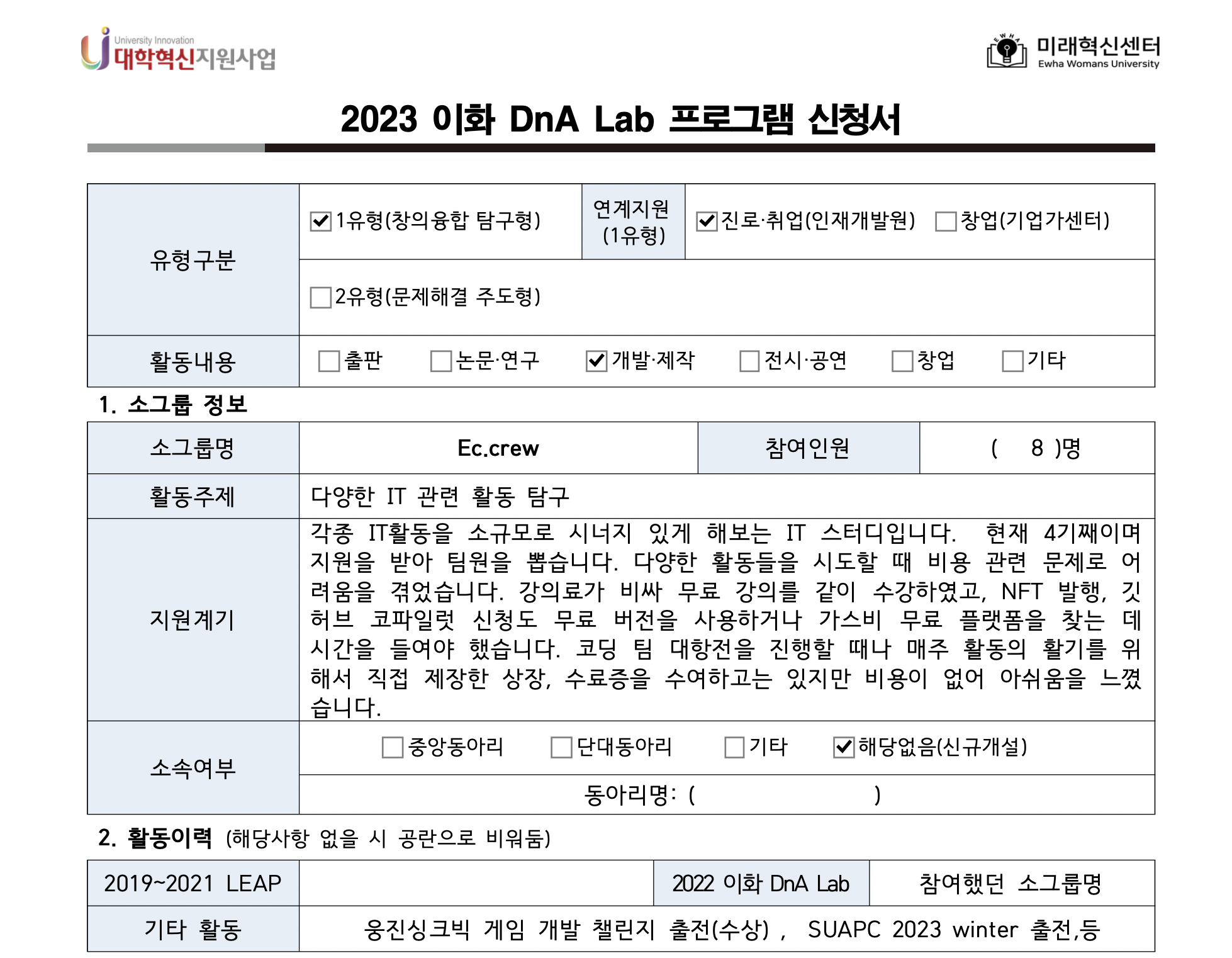 이씨크루 열심히 하다 보니 지원금이 있으면 좋을 것 같아서 신청했다.