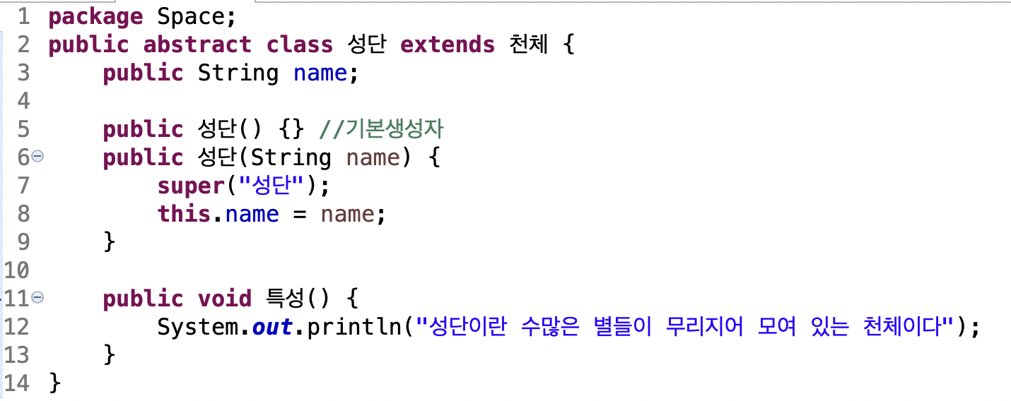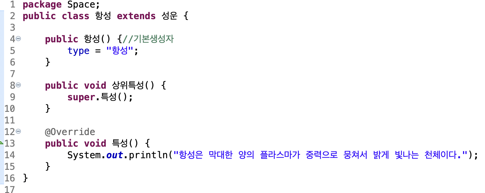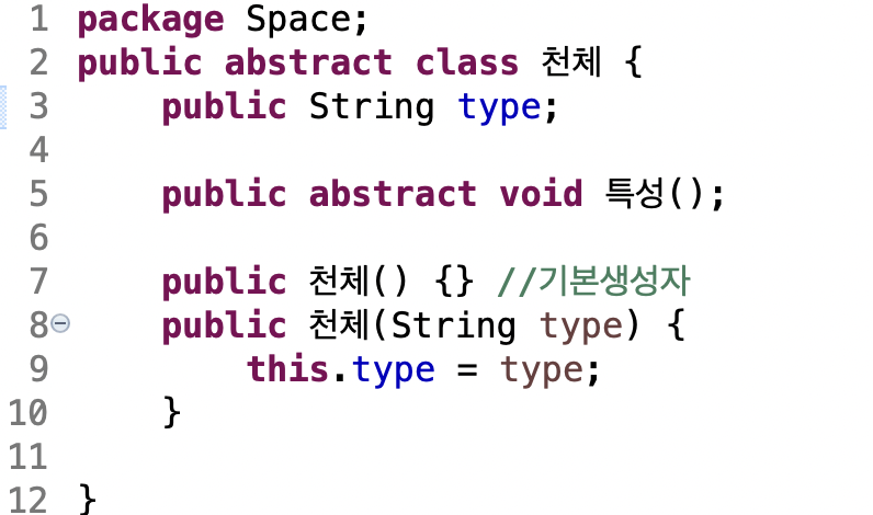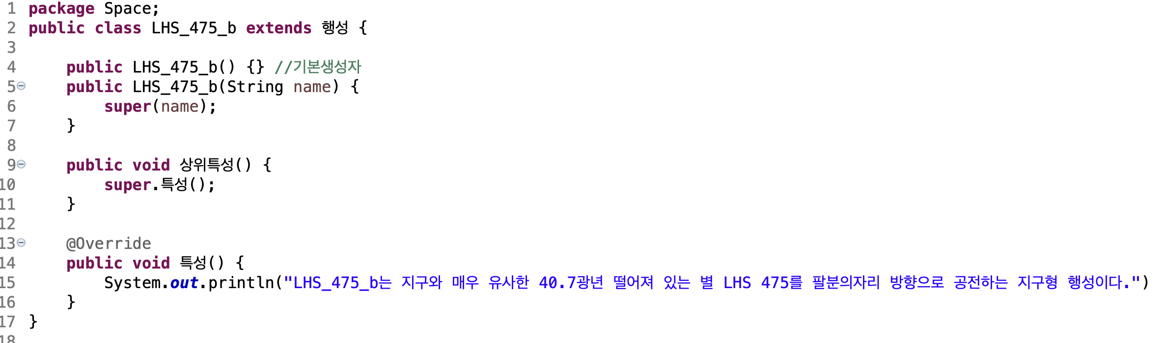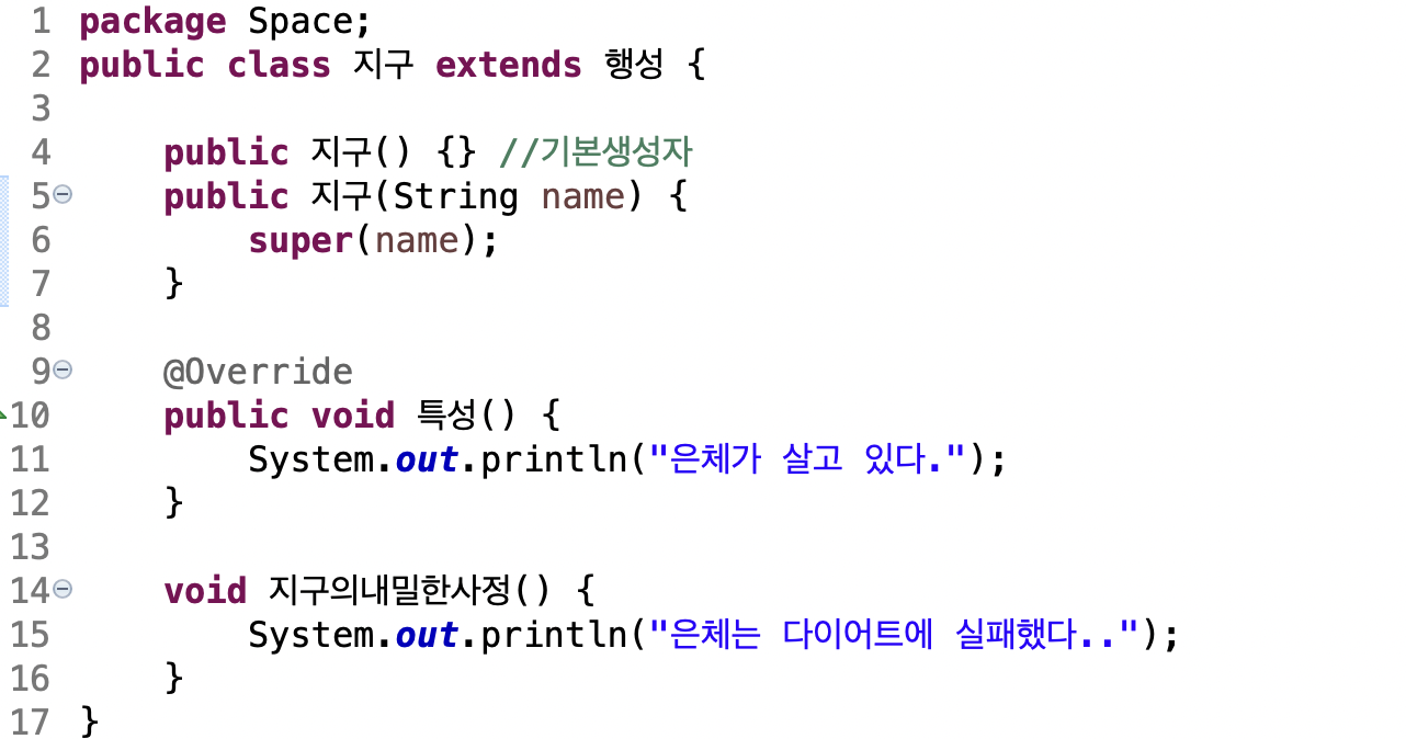 천체 추상 부모클래스의 추상 메소드 '특성'을 오버라이딩합니다.