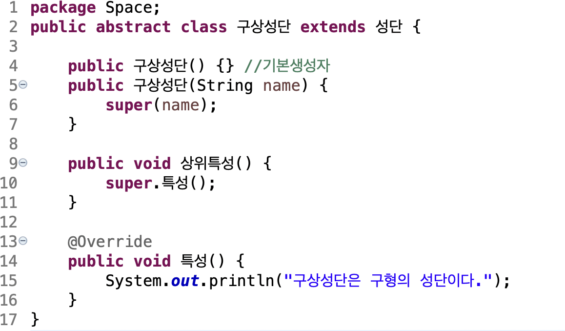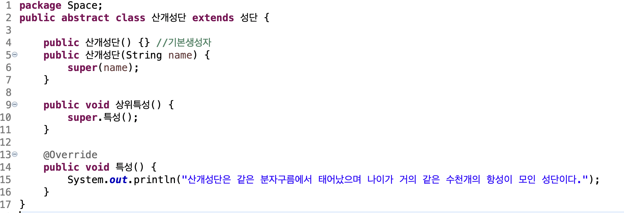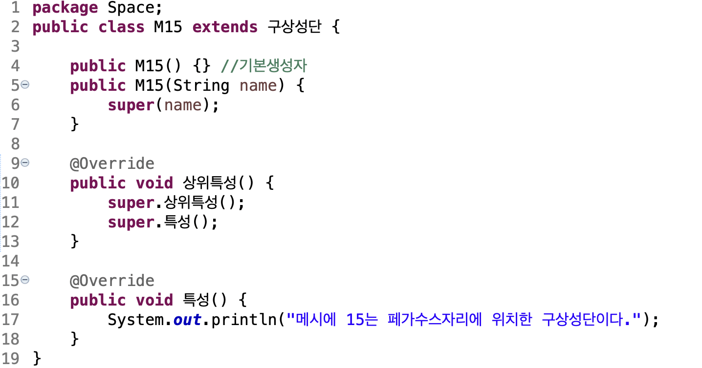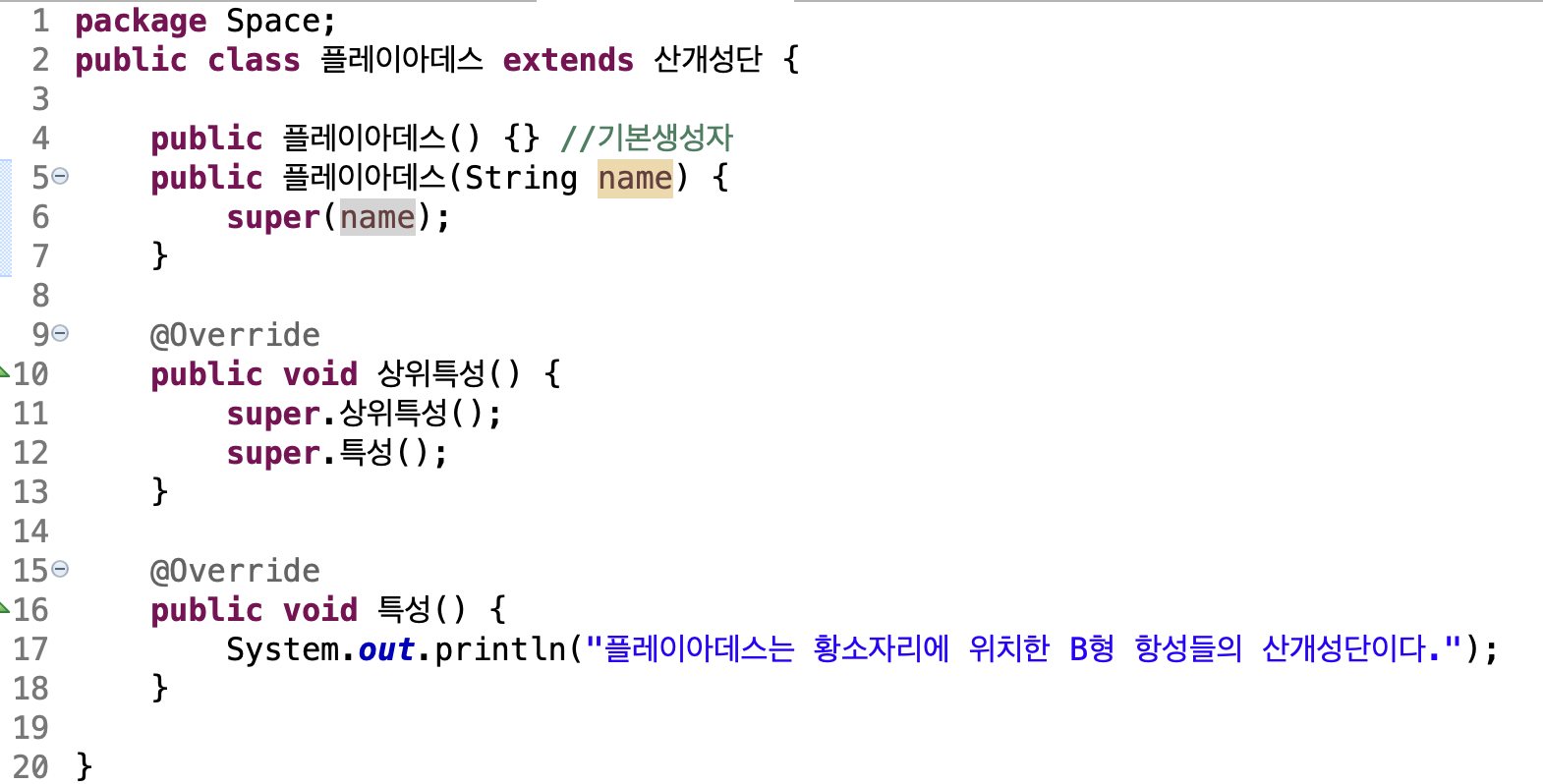 천체 추상 부모클래스의 추상 메소드 '특성'을 오버라이딩합니다.