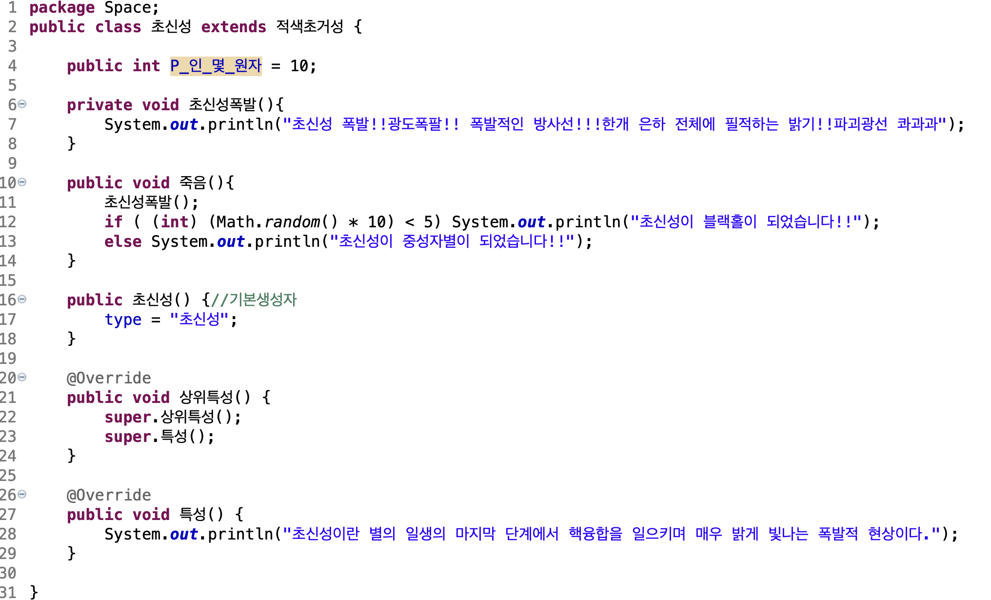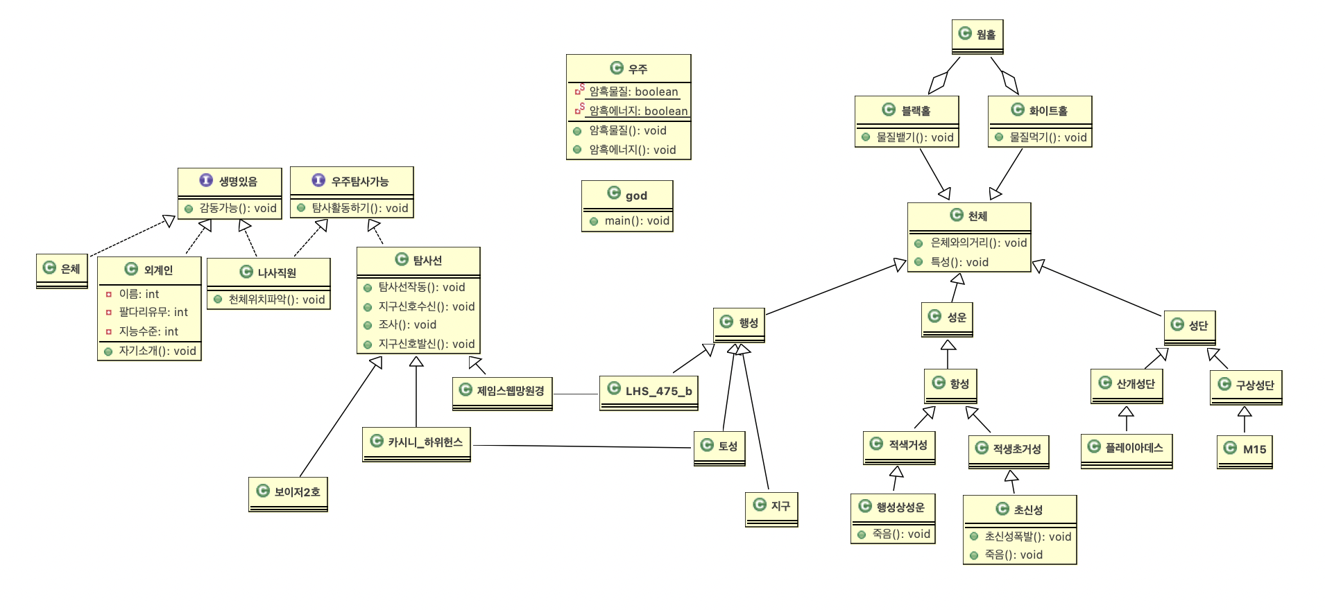 초신성,행성상성운은 죽음, 초신성폭팔 메소드 추가구현. 초신성은 Math.random으로 랜덤으로 블랙홀이나 중성자별 됨.