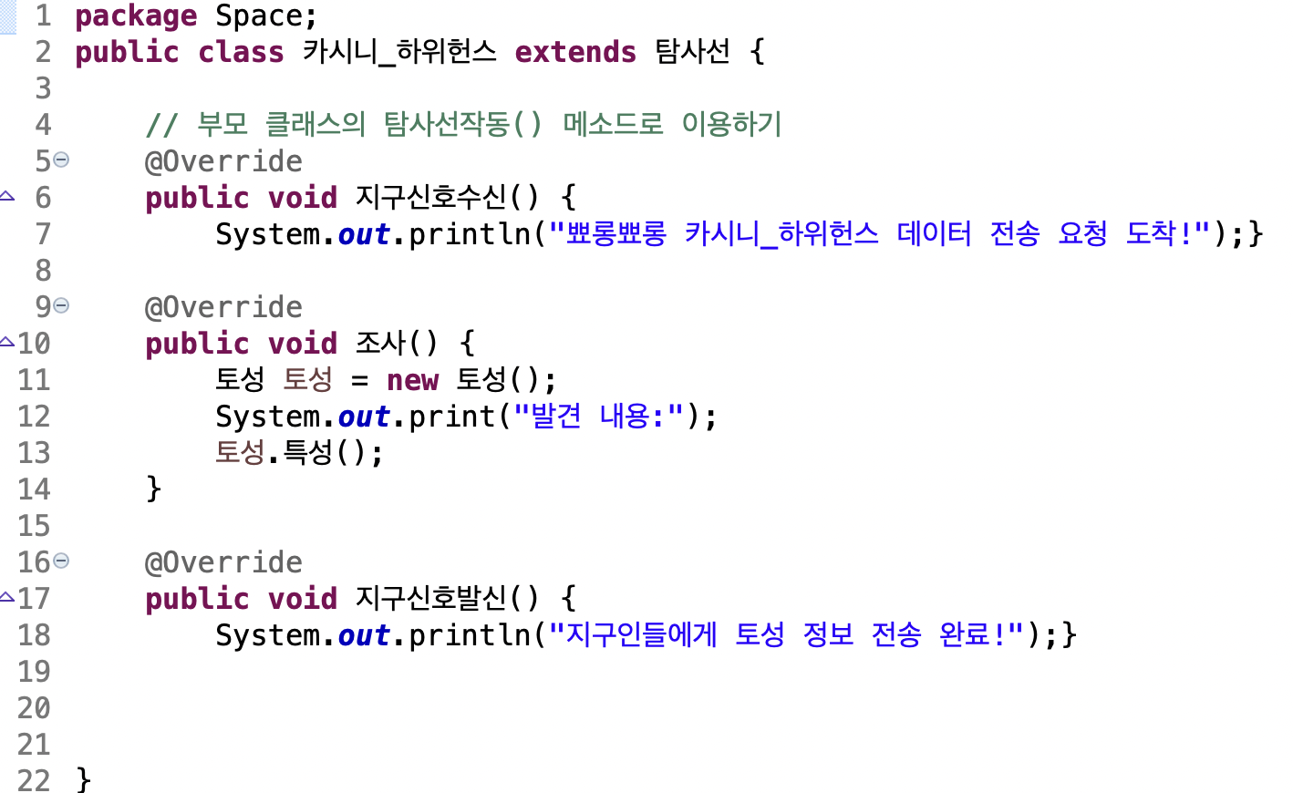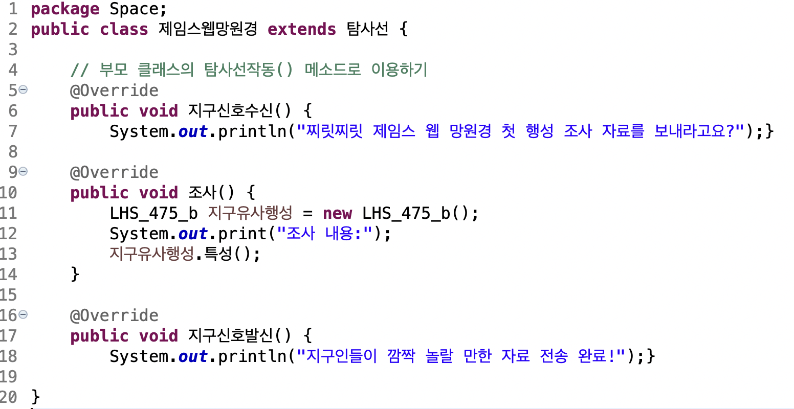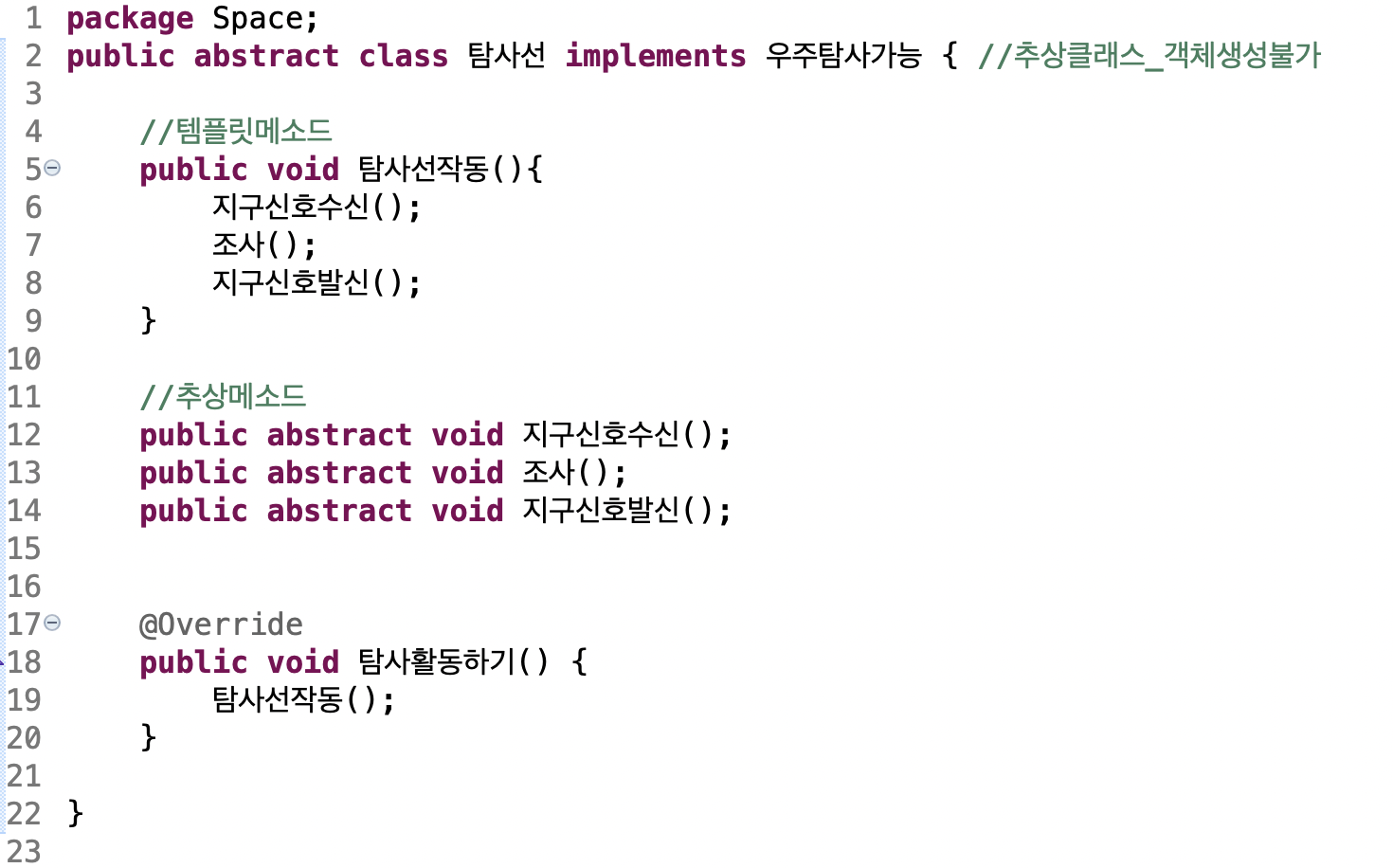 지구신호수신,조사,지구신호발신 추상메소드 구현함으로써 탐사선작동 템플릿 메소드 사용가능.