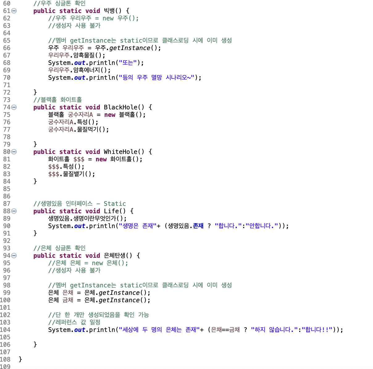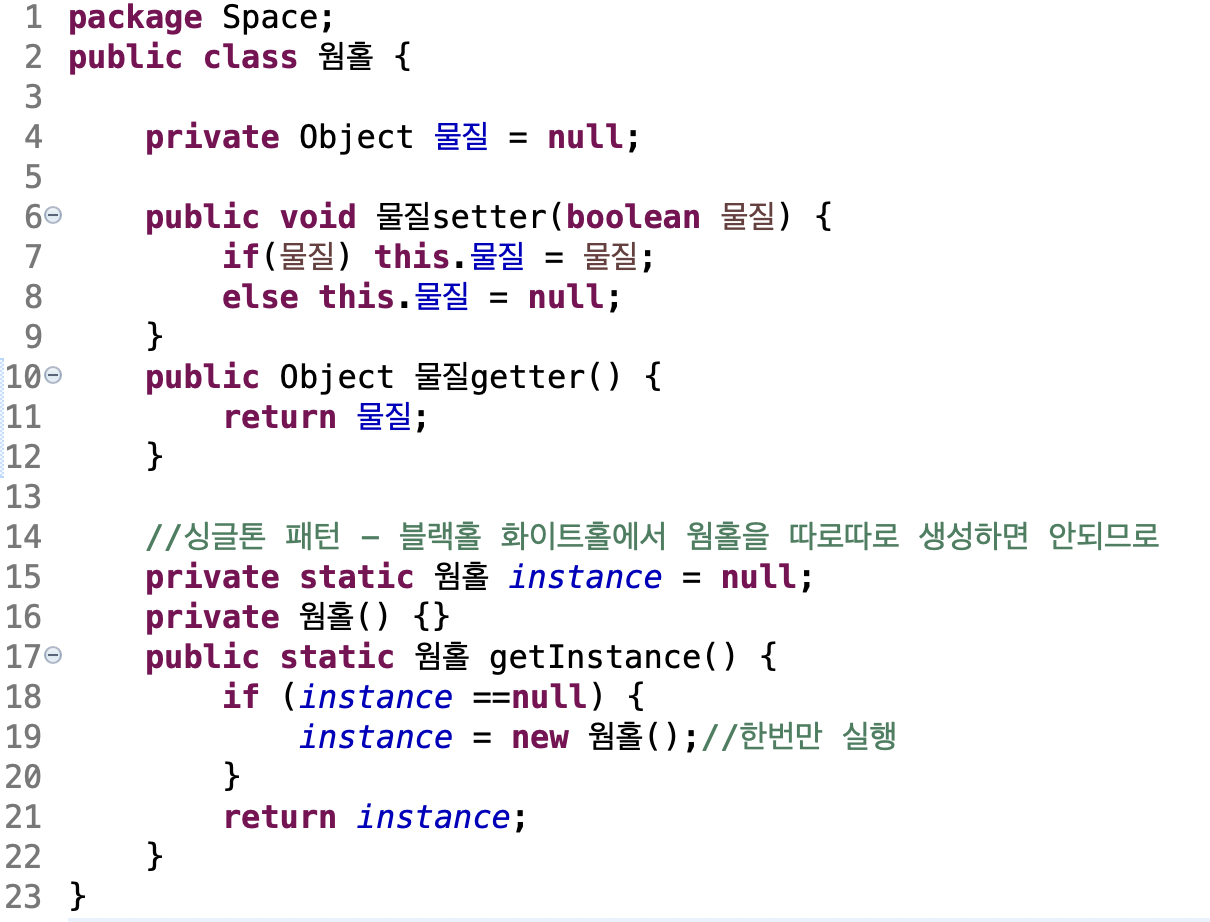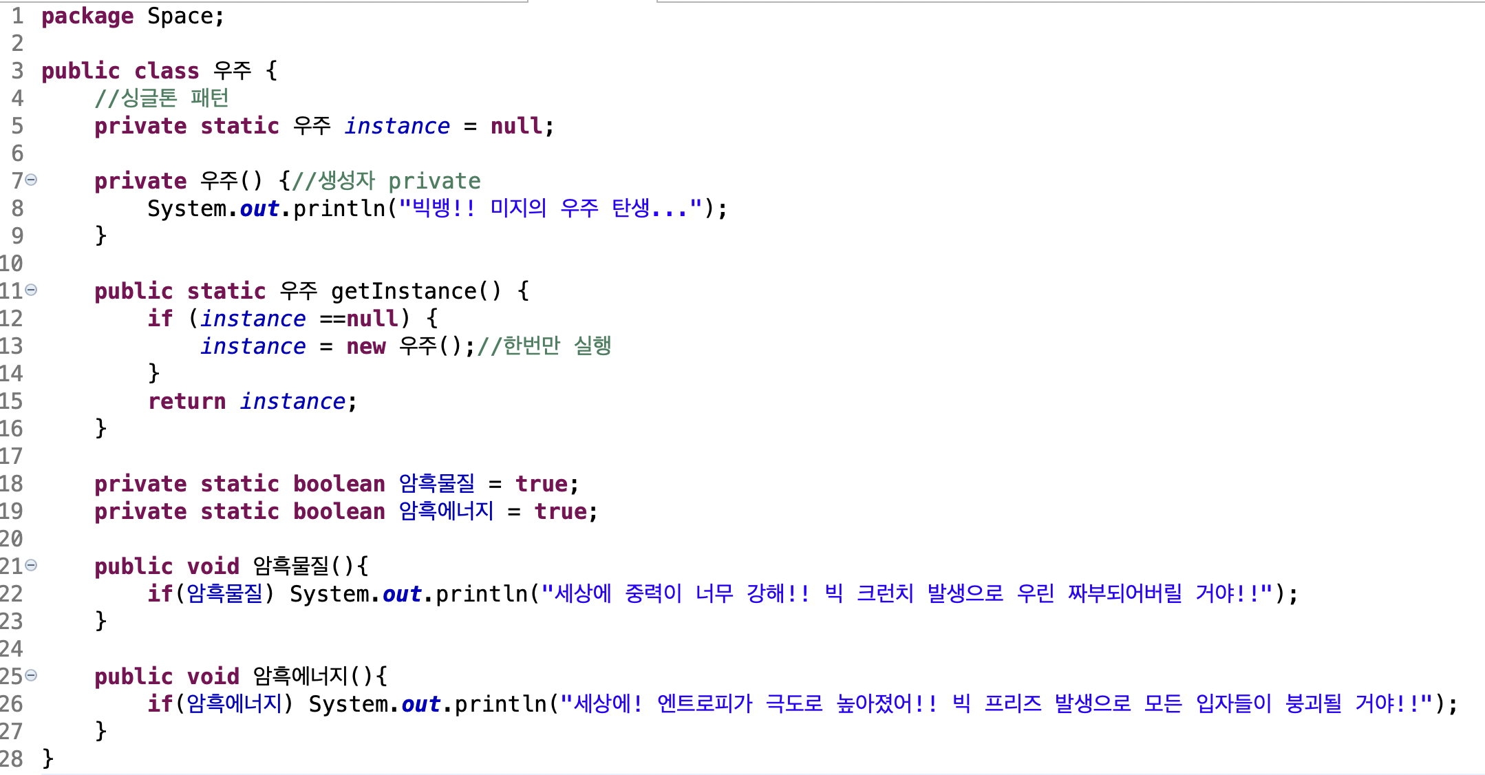 싱글톤 패턴을 이용해 단 하나의 우주만 생성될 수 있도록 합니다.