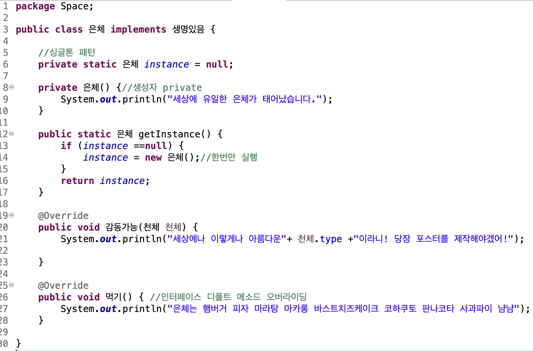 싱글톤 패턴을 이용해 단 하나의 은체만 태어날 수 있도록 합니다.
