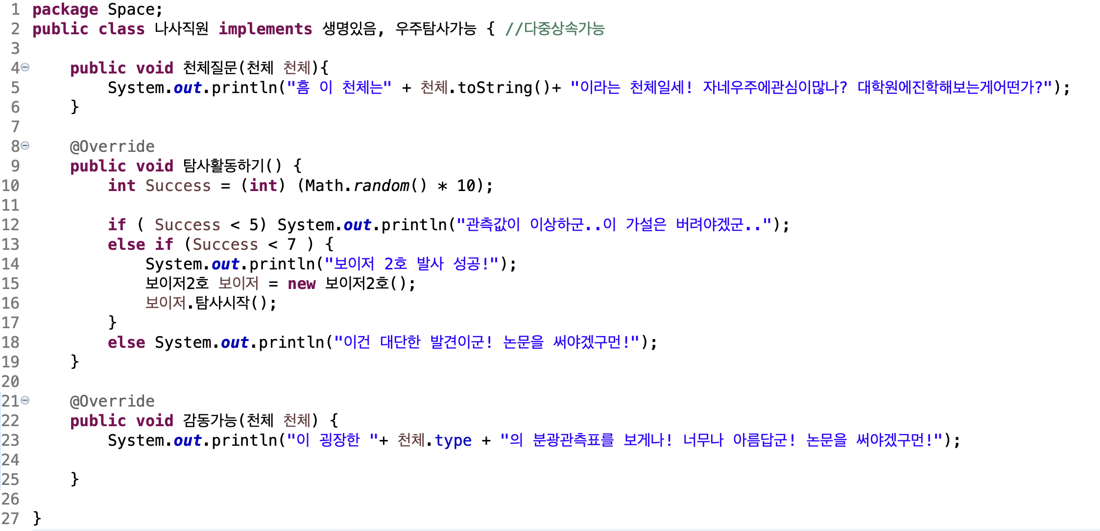 나사직원에게 천체질문을 하여 천체의 이름과 위치를 알고(toString()) 대학원진학권유를받아보세요!