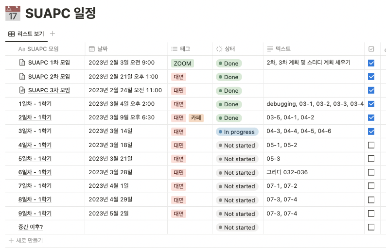 경험삼아 출전 결심! 노션 스터디 일정/ 기출 / 개인기출풀이장 / 블로그후기글.용어정리글 등 참고자료 Dev for SUAPC’23 내게 파이 한 조각을 조 north-lilac-170.notion.site 지금 이씨크루 팀원들 중 하