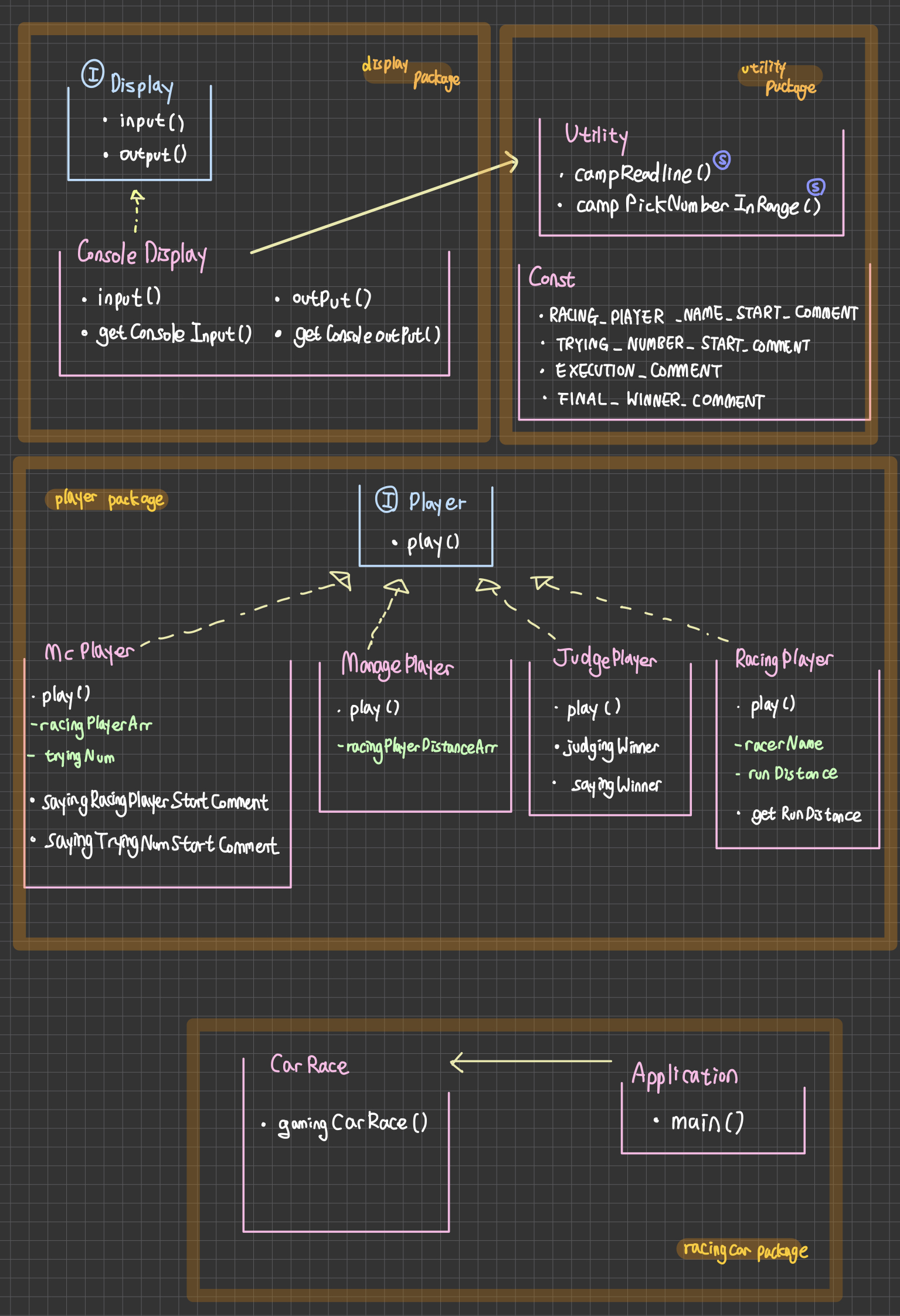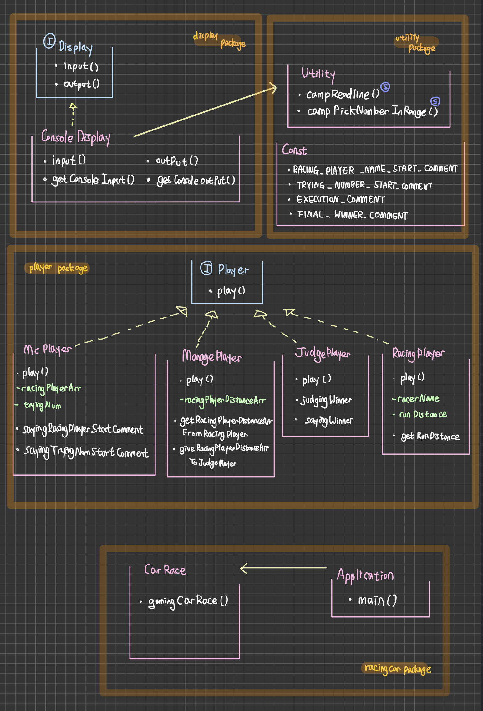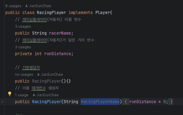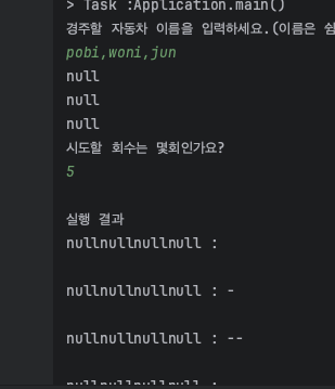 - 각 자동차에 이름을 부여할 수 있다. 전진하는 자동차를 출력할 때 자동차 이름을 같이 출력한다.⭕️