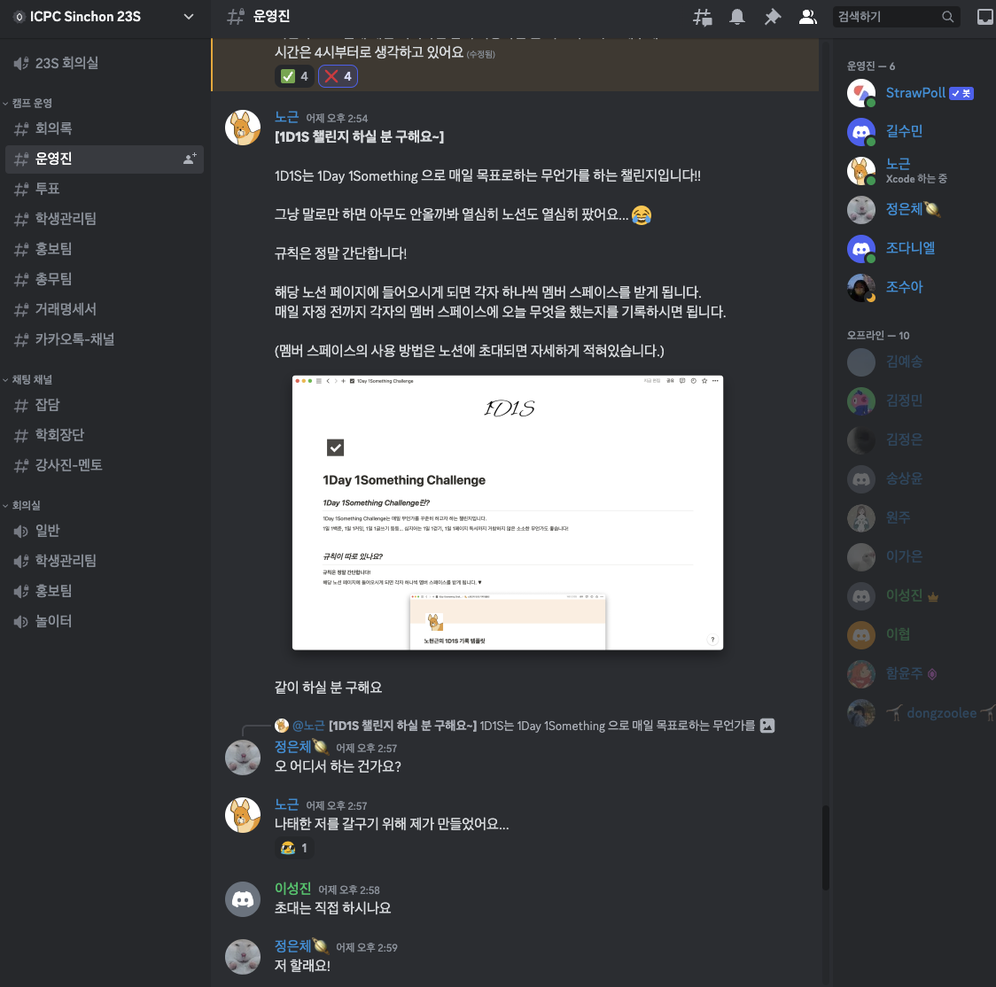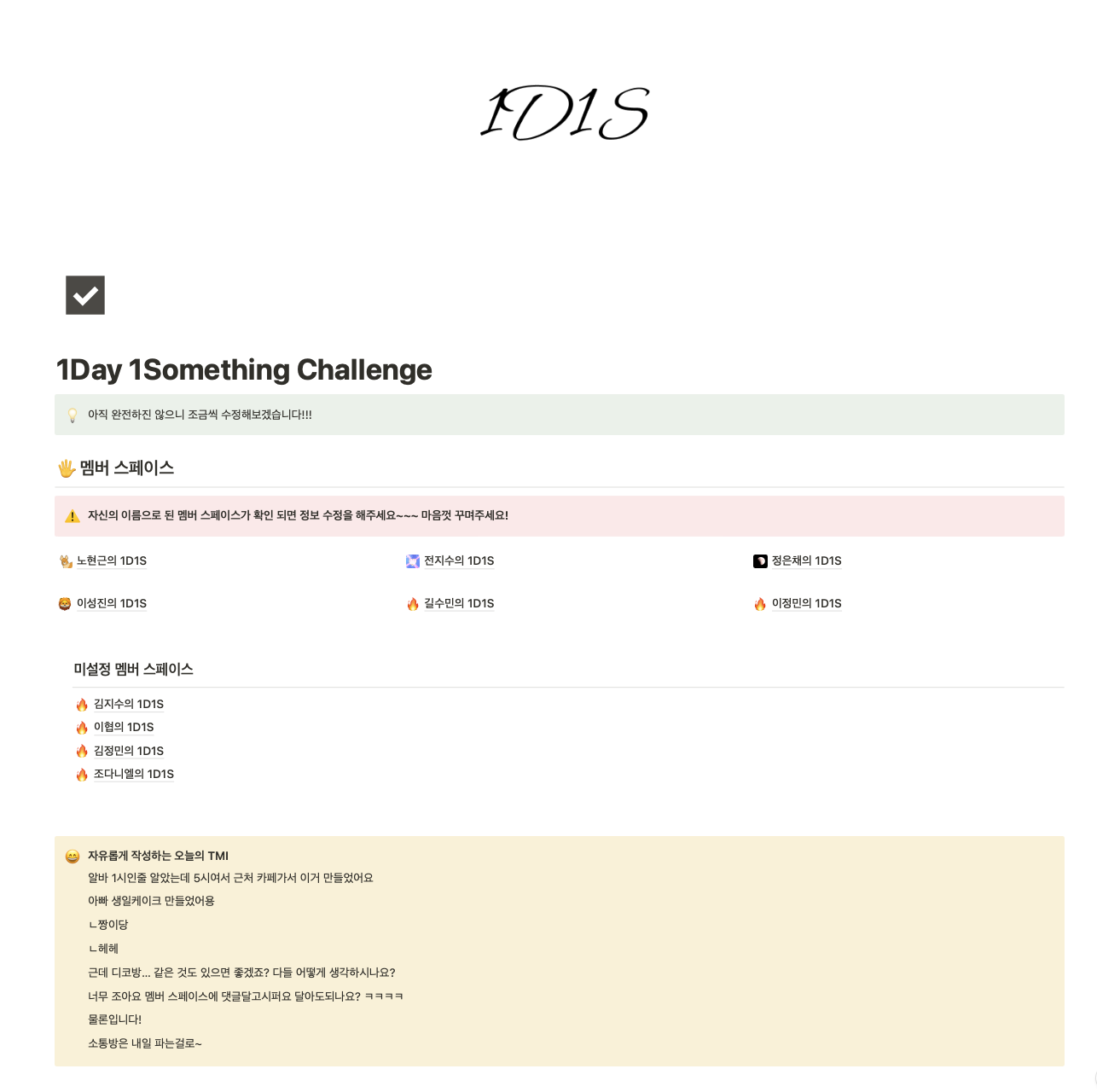 | ☑️ 𝟏𝐃𝐚𝐲 𝟏 𝐒𝐨𝐦𝐞𝐭𝐡𝐢𝐧𝐠 𝐂𝐡𝐚𝐥𝐥𝐞𝐧𝐠𝐞 🏁 시즌 2 (5) | 2023.10.02 |