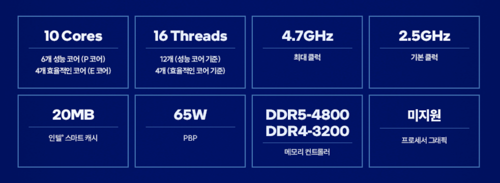 인텔(소켓1700) / 10nm(인텔7) / P6+E4코어 / 12+4쓰레드 / 기본 클럭:2.5GHz / 최대 클럭:4.7GHz / L2 캐시:9.5MB / L3 캐시:20MB / PBP-MTP:65-148W / PCIe5.0, 4.0 / 메모리 규격:DDR5, DDR4 / 4800, 3200MHz / 내장그래픽: 미탑재 / 기술 지원:하이퍼스레딩 / 쿨러:인텔 기본쿨러 포함 / 시네벤치R23(싱글):1790 / 시네벤치R23(멀티):17804