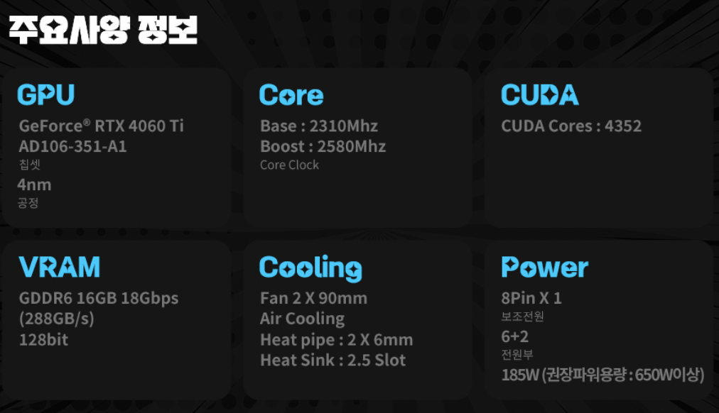 RTX 4060 Ti / 4nm / 베이스클럭:2310MHz / 부스트클럭:2580MHz / 스트림 프로세서:4352개 / PCIe4.0x16(at x8) / GDDR6(DDR6) / 출력단자:HDMI2.1;DP1.4 / 부가기능:제로팬(0-dB기술);8K 지원;4K 지원;HDR 지원;HDCP 2.3 / 사용전력:185W / 정격파워 550W 이상 / 전원 포트:8핀 x1 / 전원부:6+2페이즈 / 2개 팬 / 가로(길이):255mm / 두께:45.5mm / 백플레이트 / LED 라이트 / 오버클럭 물리키 / A/S 3년