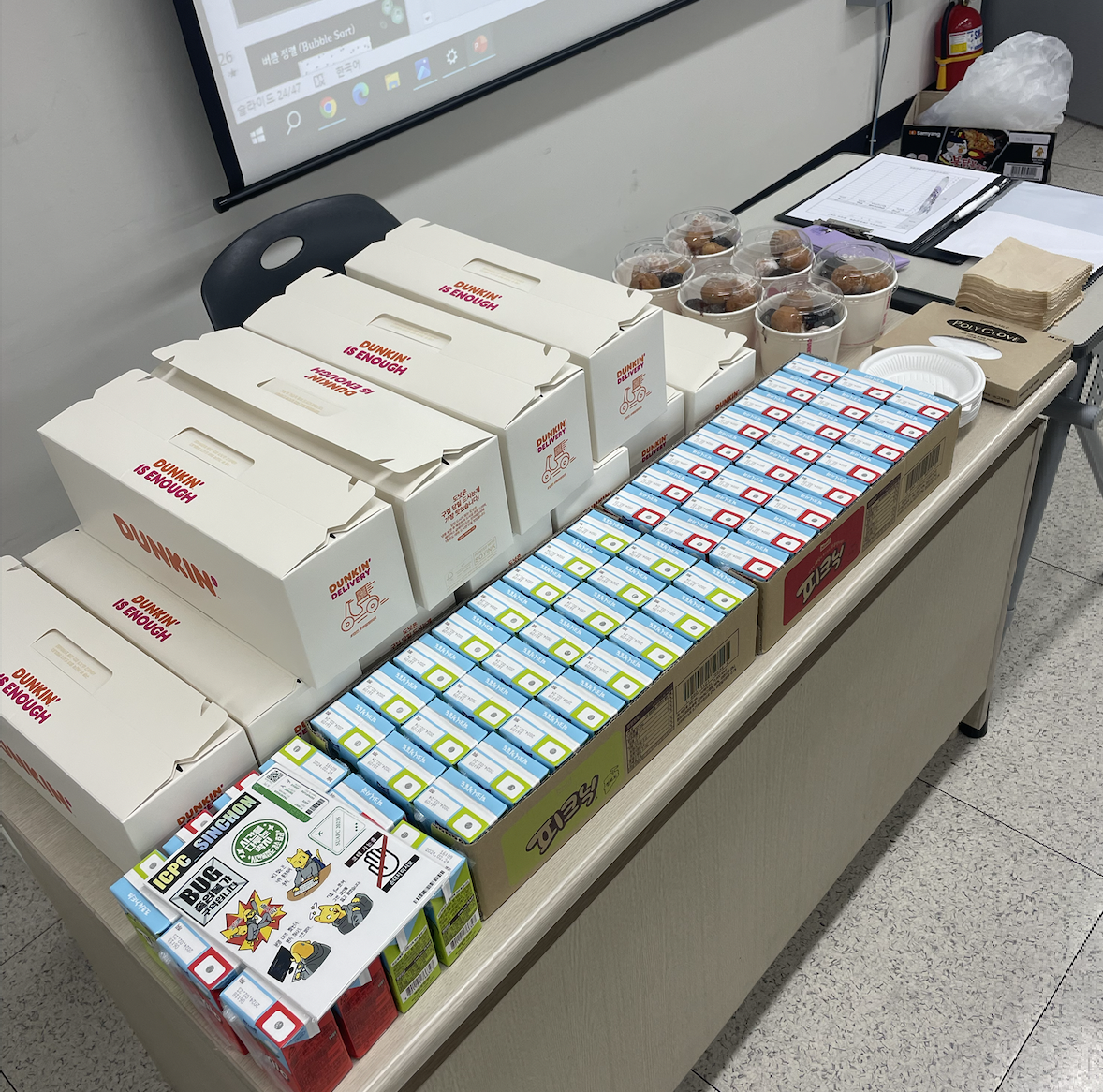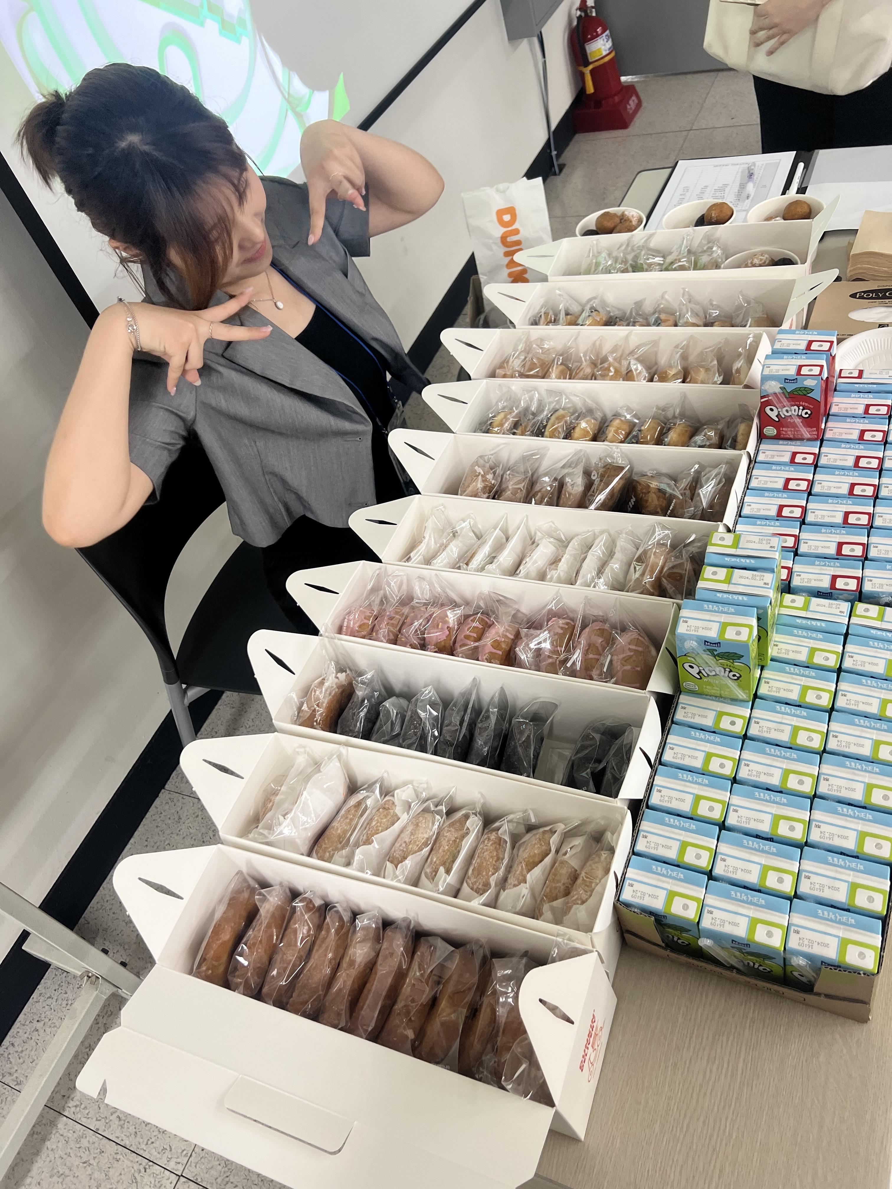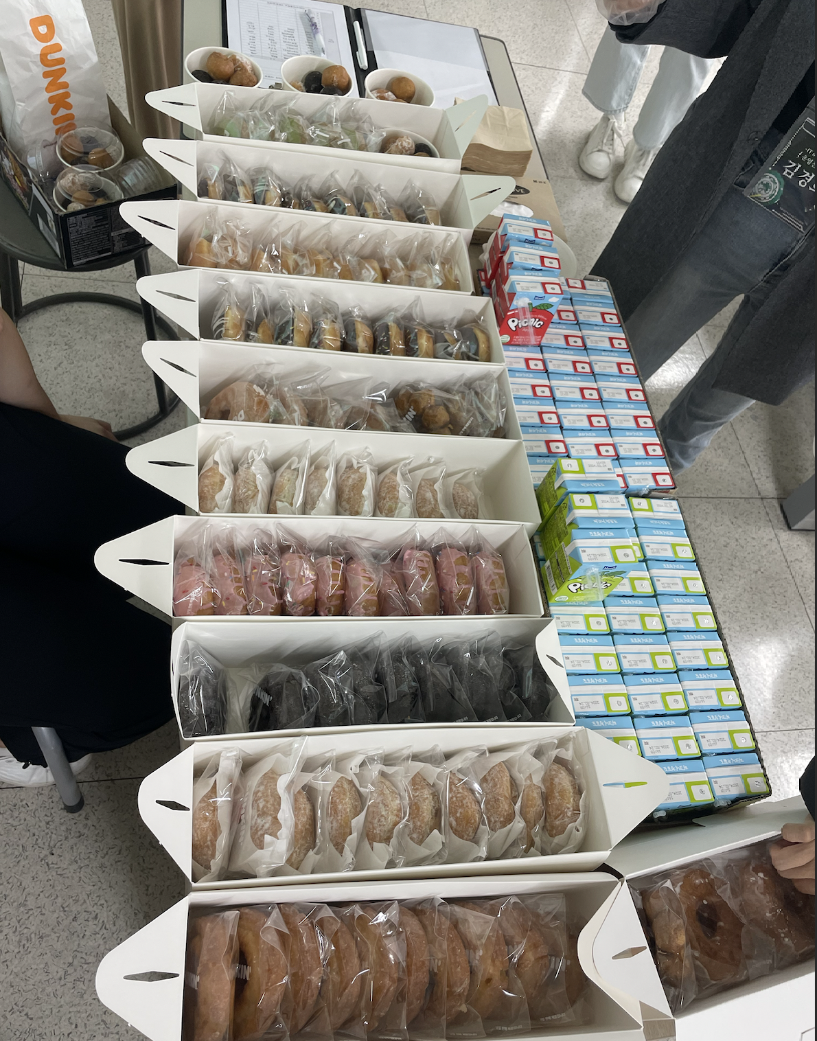 도넛 나눠주기 했는데 사장 같고 좋았다. 노년에 도넛 장사를 해야겠다