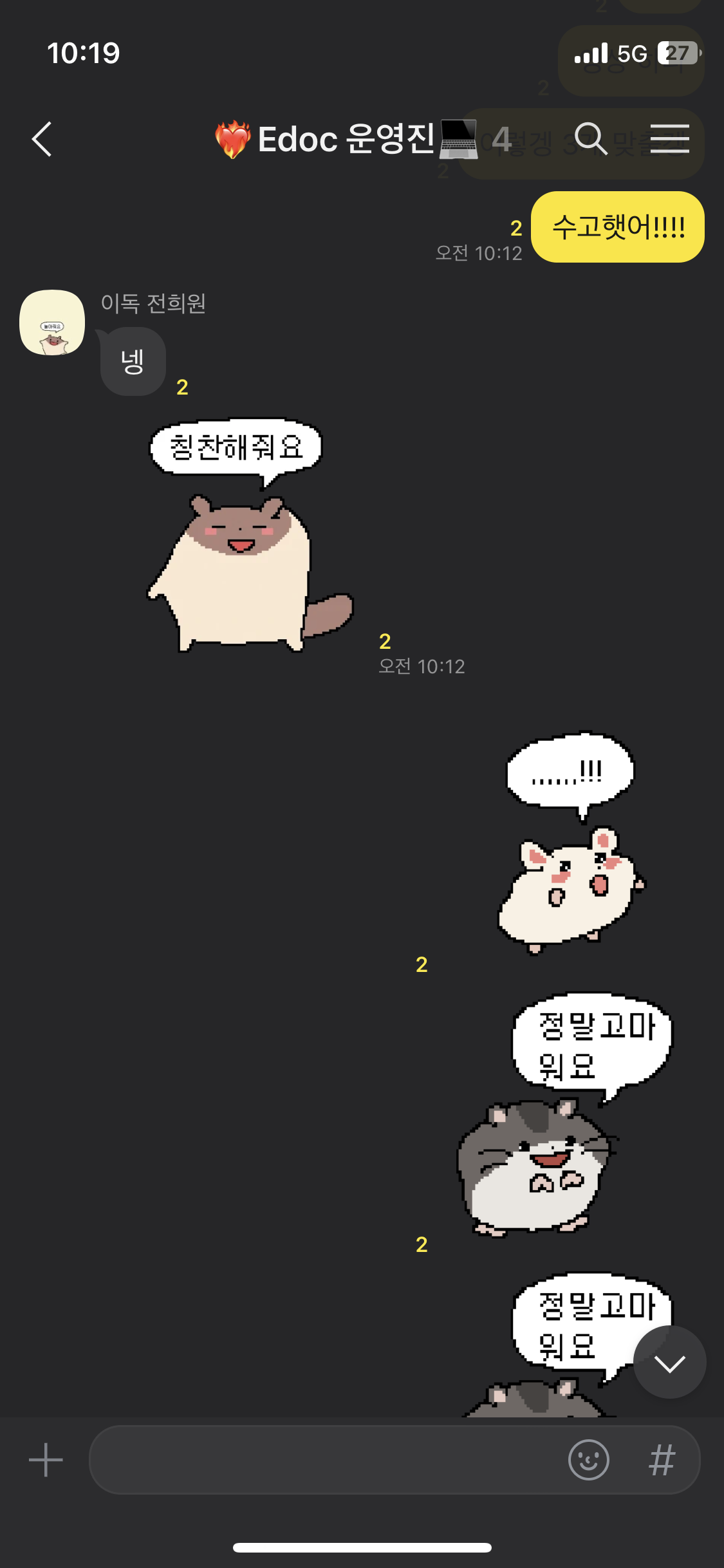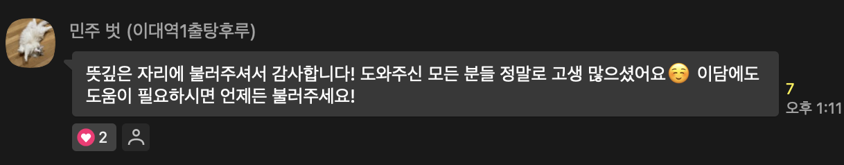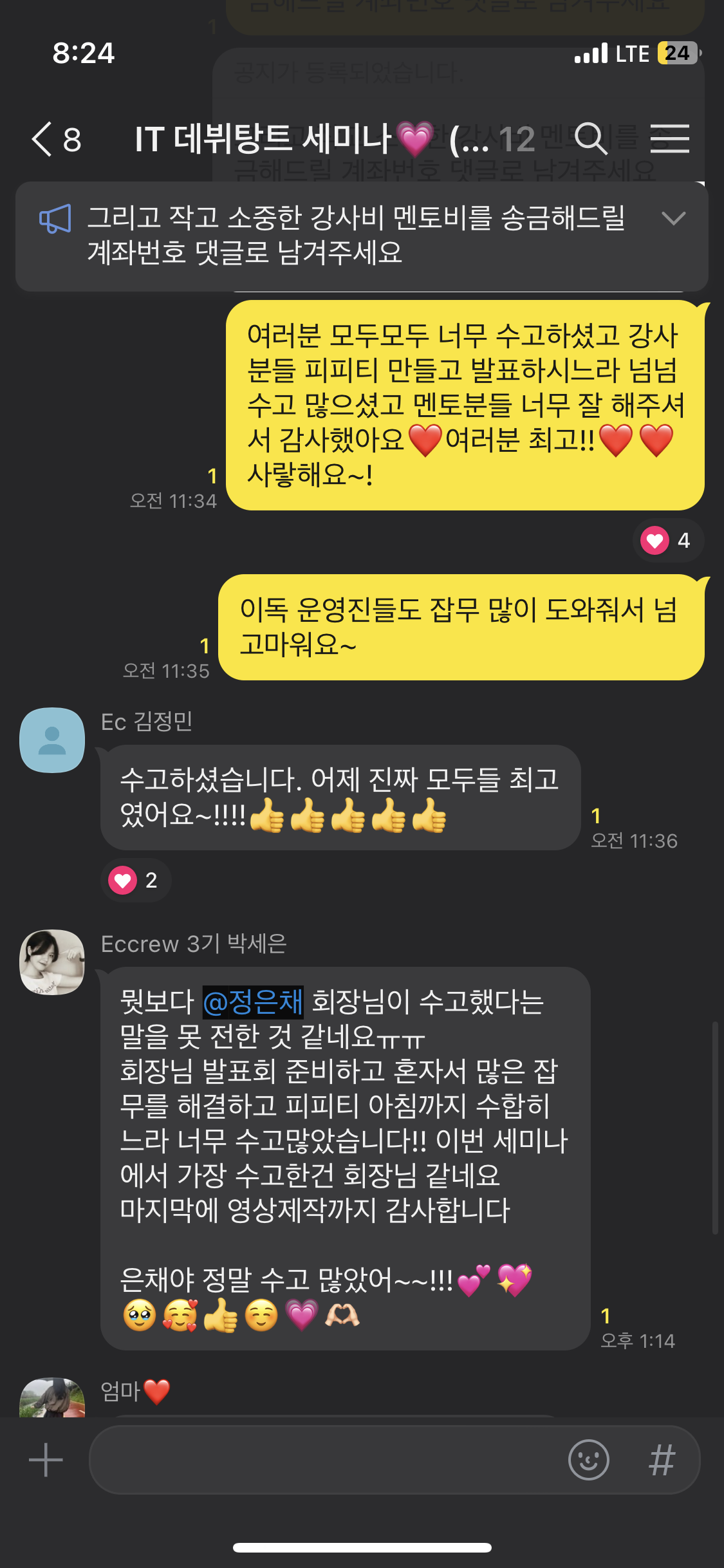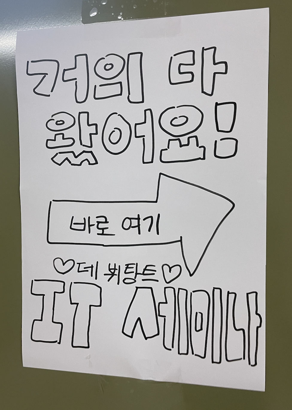 여러분은 이독 부원이 아니시지만 저희 세미나로 스터디가 맺어지게 되셨으니 명예 세미 이독입니다🥰세미나 단톡을 통해 이독의 프로젝트들을 공유해 드리겠습니다. (이번 icpc 참여부터 신촌 연합 활동 참여,suapc 참여 공지, 이독 외부 학생 강사 세미나 참여 등) 그리고 궁금한 사항은 저나 멘토에게 물어보셔도 됩니다!