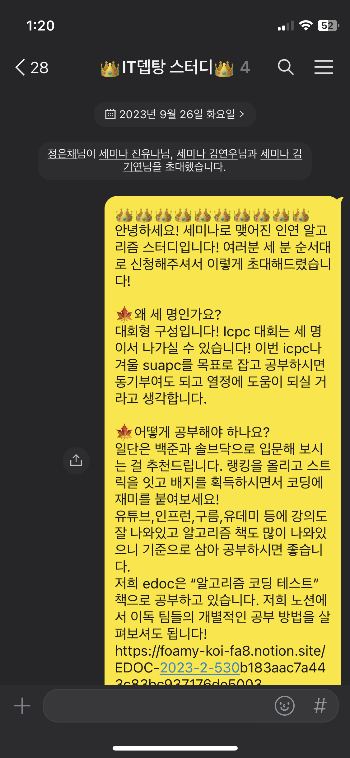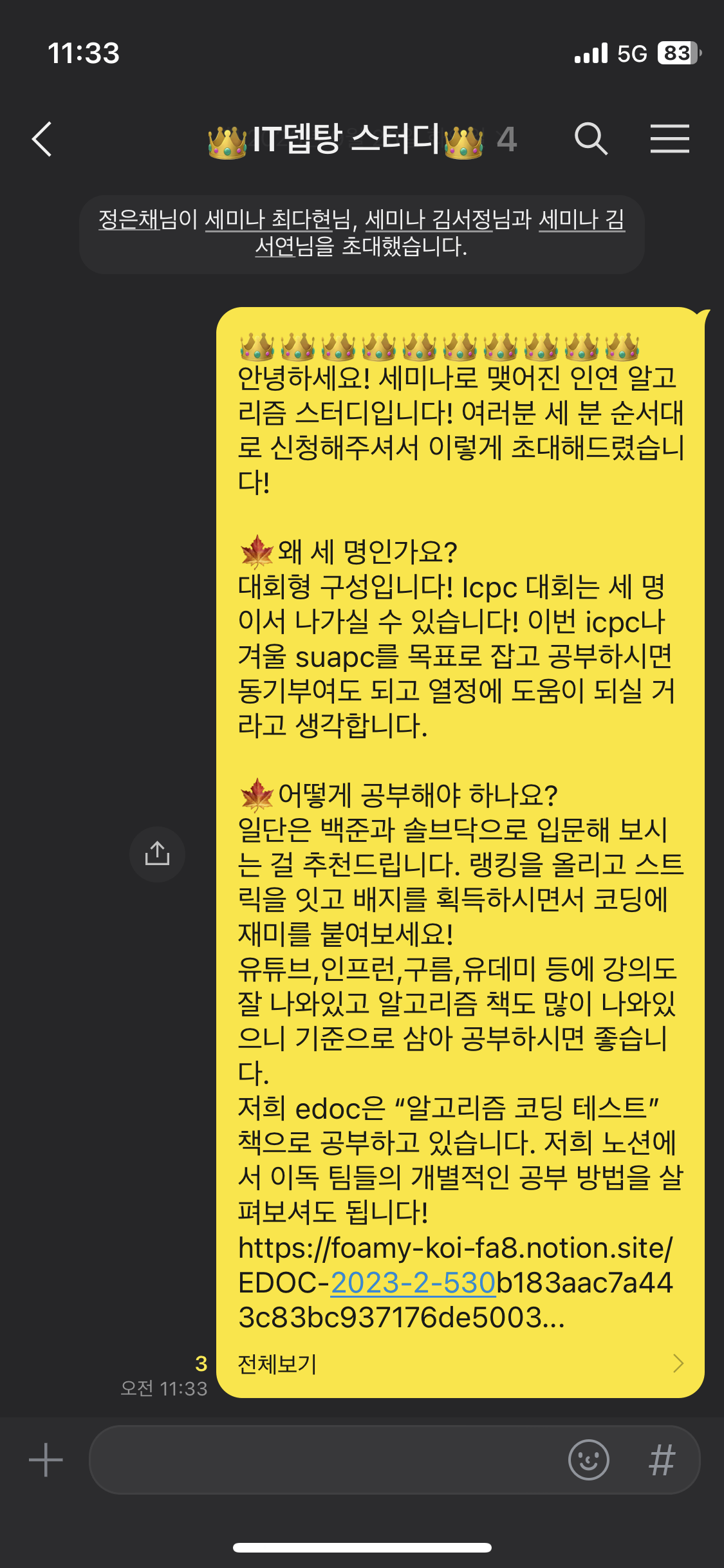 안녕하세요! 세미나로 맺어진 인연 알고리즘 스터디입니다! 여러분 세 분 순서대로 신청해주셔서 이렇게초대해드렸습니다!
