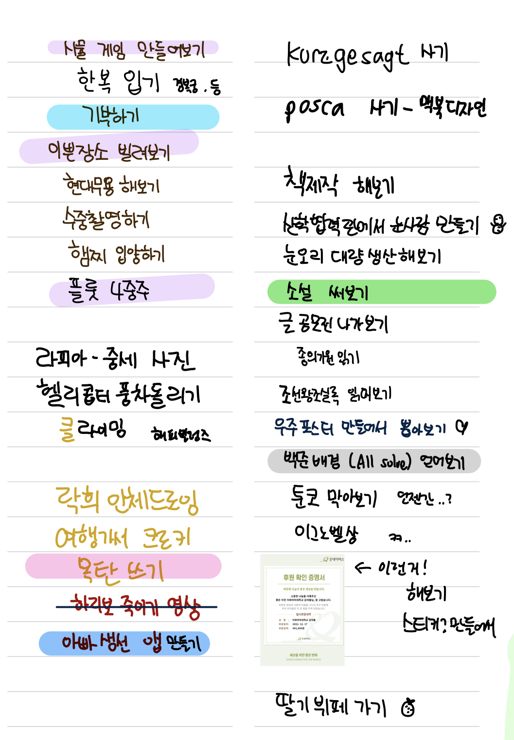 오른쪽은 내가 쓴 대학생활용 버킷리스트