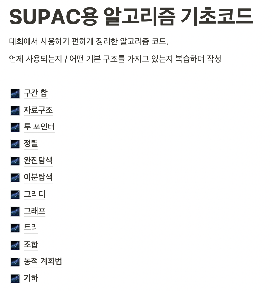 경험삼아 출전 결심! 노션 스터디 일정/ 기출 / 개인기출풀이장 / 블로그후기글.용어정리글 등 참고자료 Dev for SUAPC’23 내게 파이 한 조각을 조 north-lilac-170.notion.site 지금 이씨크루 팀원들 중 하